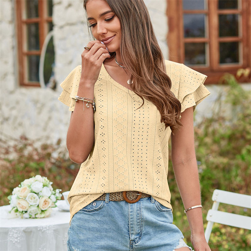 100% brand newFabric Name: Knitted Mesh JacquardMaterial: PolyesterPattern: Solid colorSleeve length: short sleevedStyle: slim fitSleeve Type: Lotus Leaf SleeveCollar type: V-neckColor: As shown in the picture (due to the shooting environment and lighting, there may be color errors)The size is Asian size, please note before purchasing.The size is manually measured and may have an error…