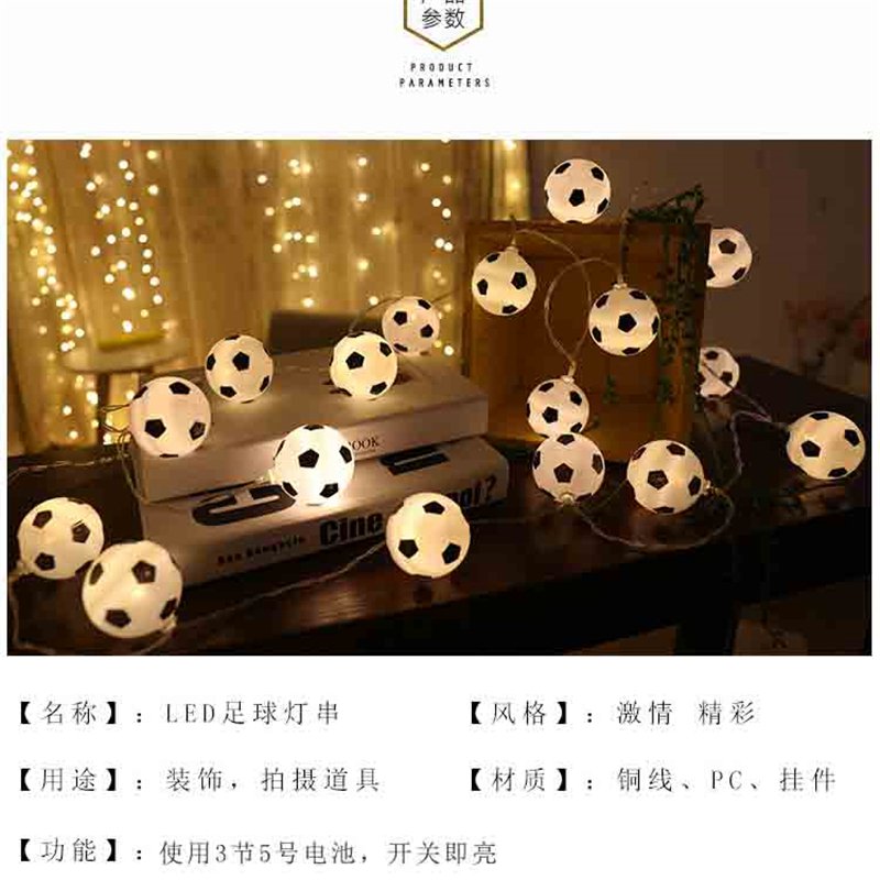 10led football decoration string lightsProduct description:1. Name: 10led football decoration string lights2. Number of leds: 10led3. Style: Football4. Power supply: battery (self-provided)5. Luminous flux: 10 (LM)6. Shell material: plastic7. Can dimming: No