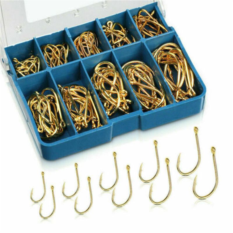 Color:Gold, Black,Silver Material:High Carbon Steel Suitable for: This is a universal hook, suitable for a variety of fish, using steel wire or cord can be.Package Includes: 100Pcs Fishing Hooks (With a Box)