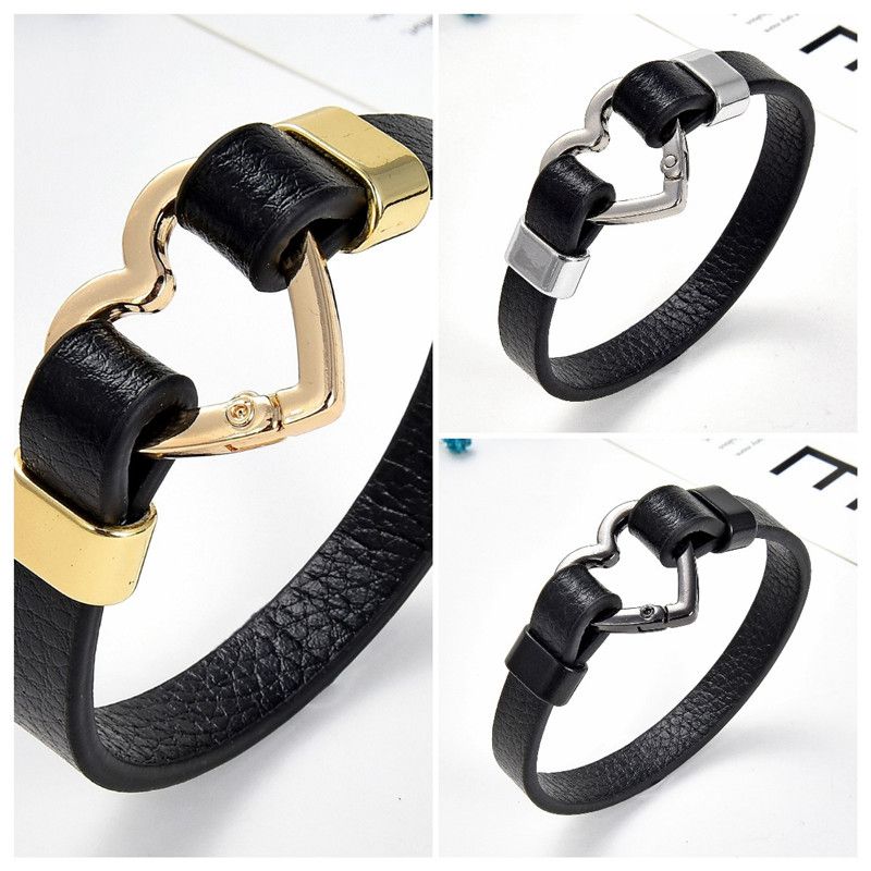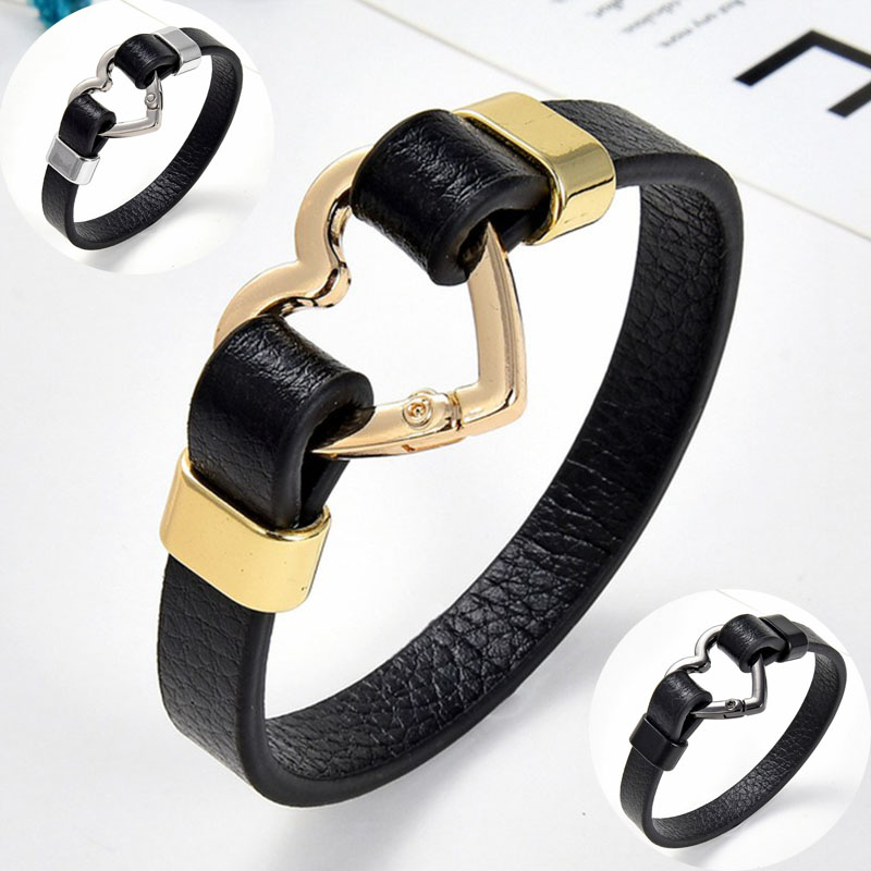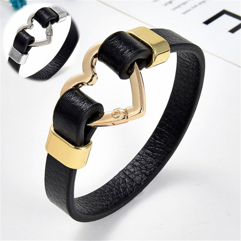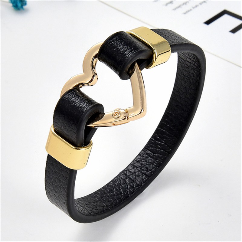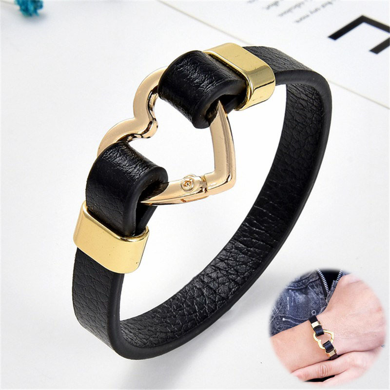 2024 Trendy Heart Shape Spring Clasp Women Bracelet Gold Metal Black Leather Bracelets Girl Fashion Jewelry Wholesale