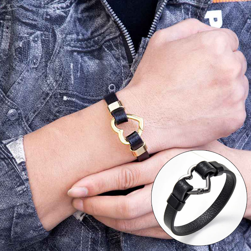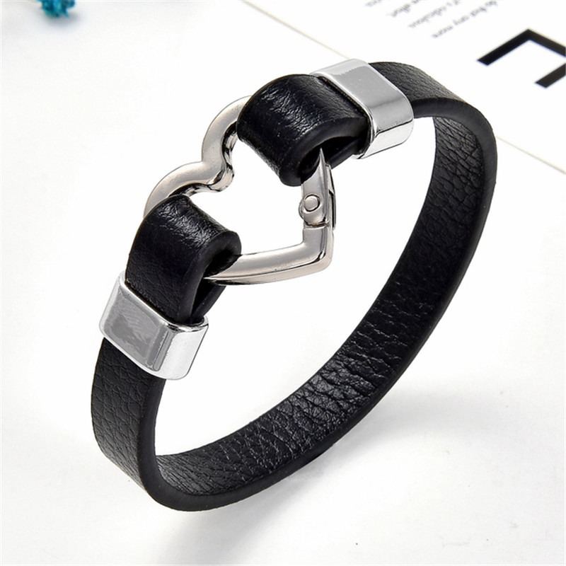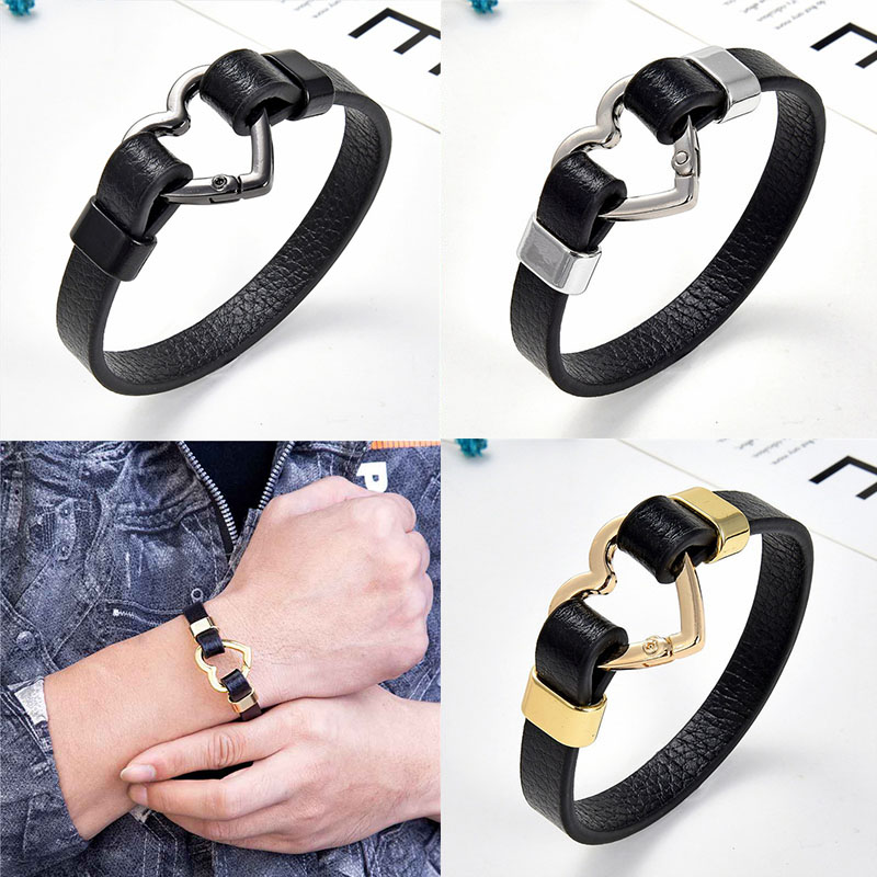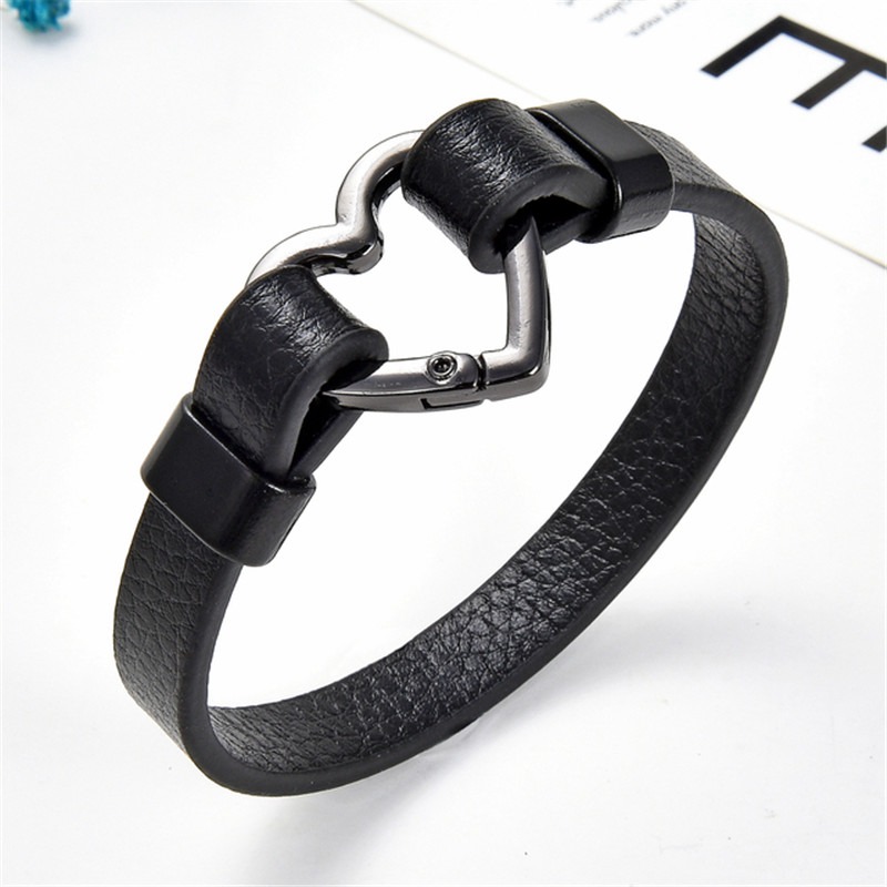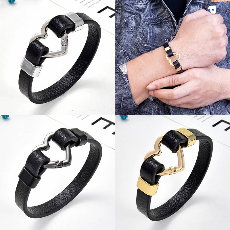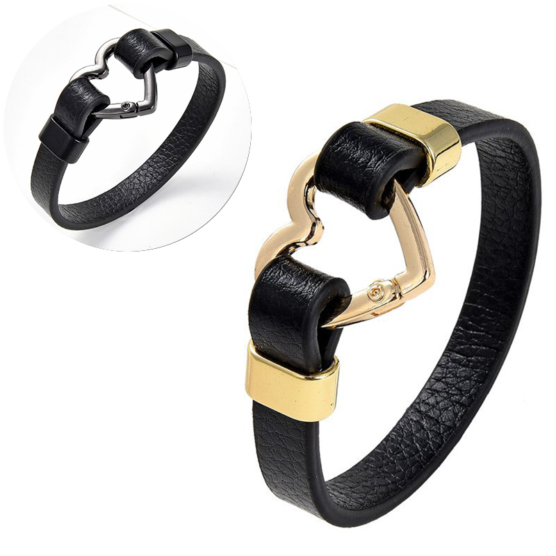 2024 Trendy Heart Shape Spring Clasp Women Bracelet Gold Metal Black Leather Bracelets Girl Fashion Jewelry Wholesale