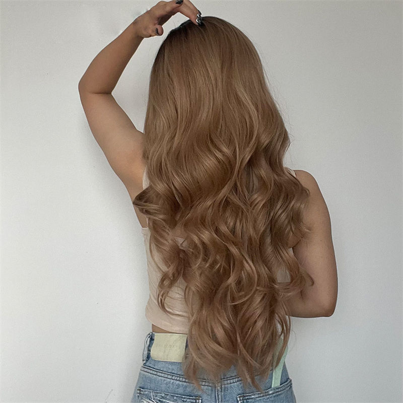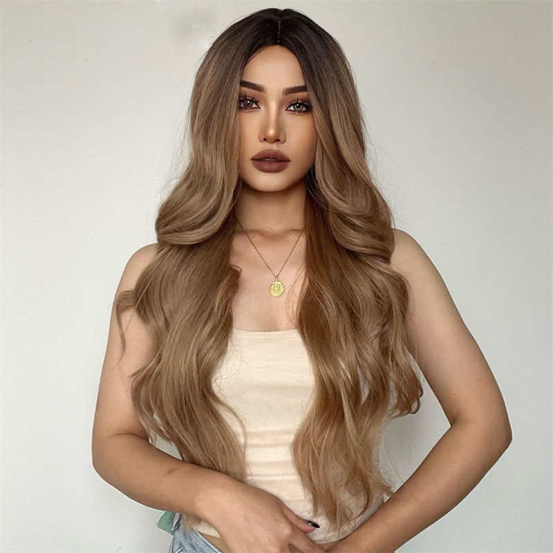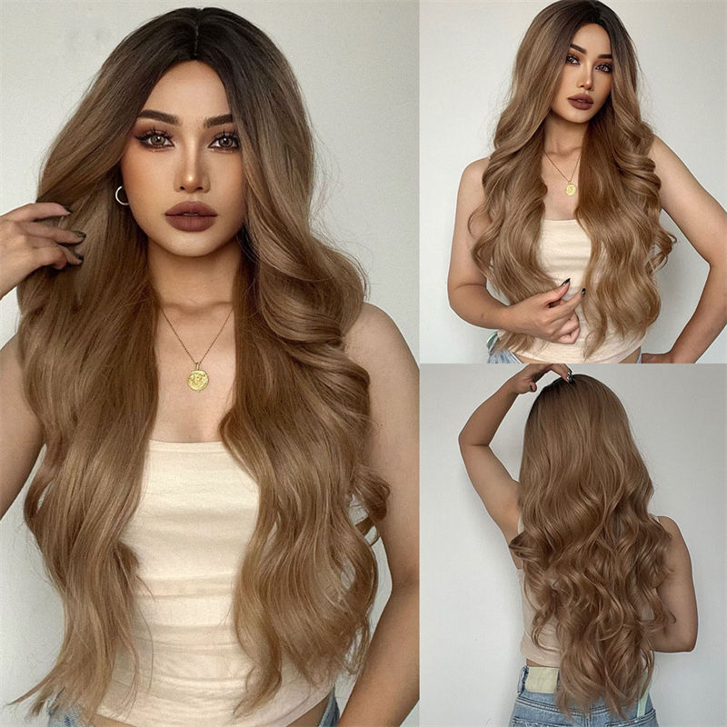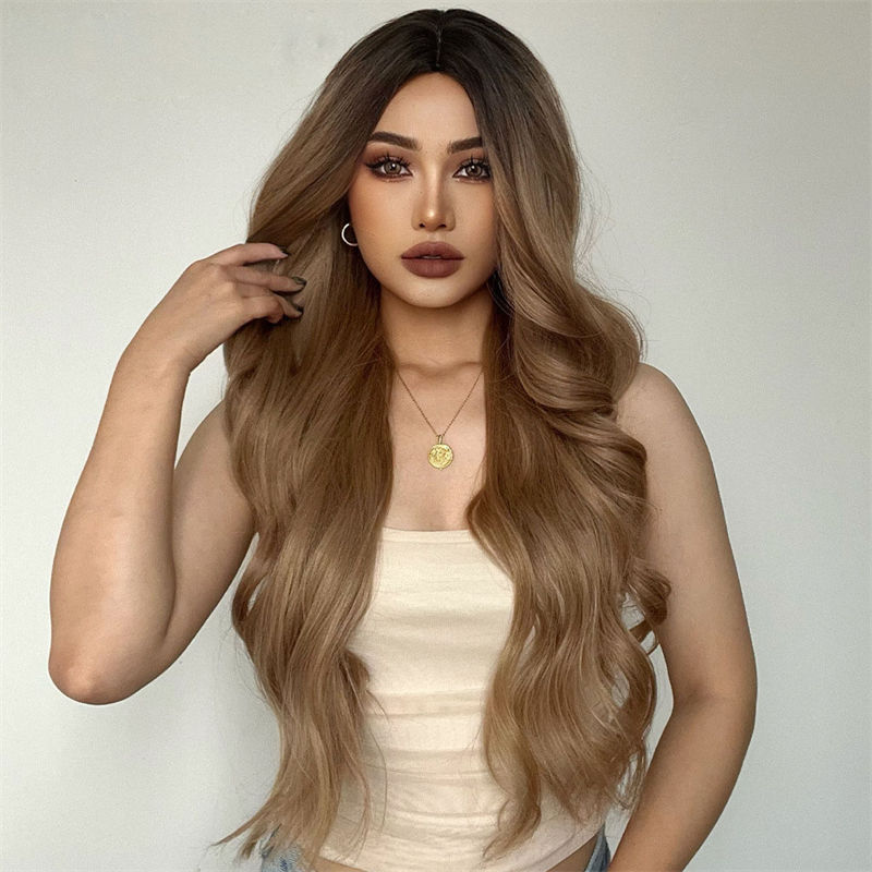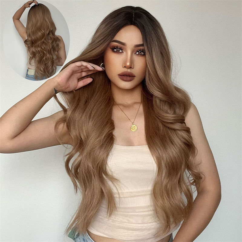 Ladies Wig Wig Brown Medium Gradient Long Curly Hair Chemical Fiber High-Temperature Fiber Wig