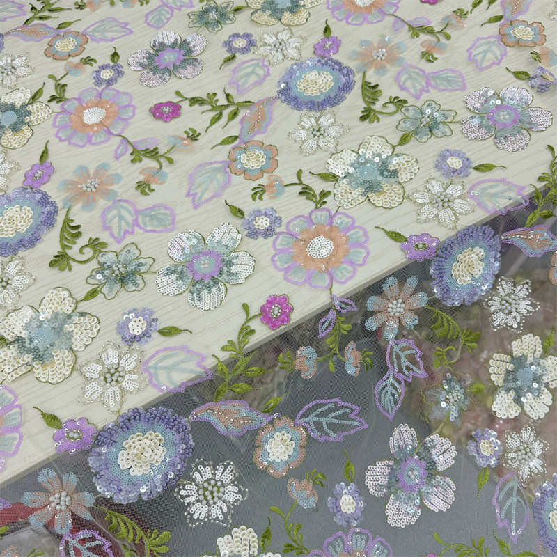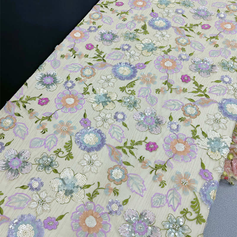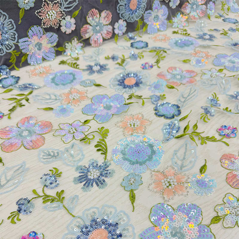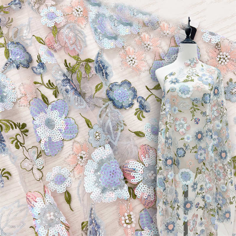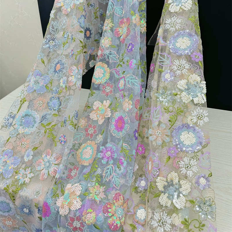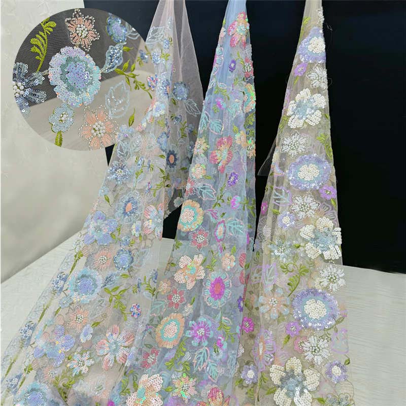 Multi-Color Floral Embroidery Lining Sequins Pearl Embroidery Wedding Dress Fabric