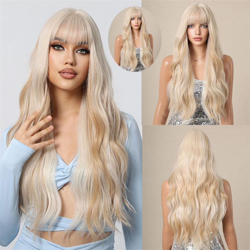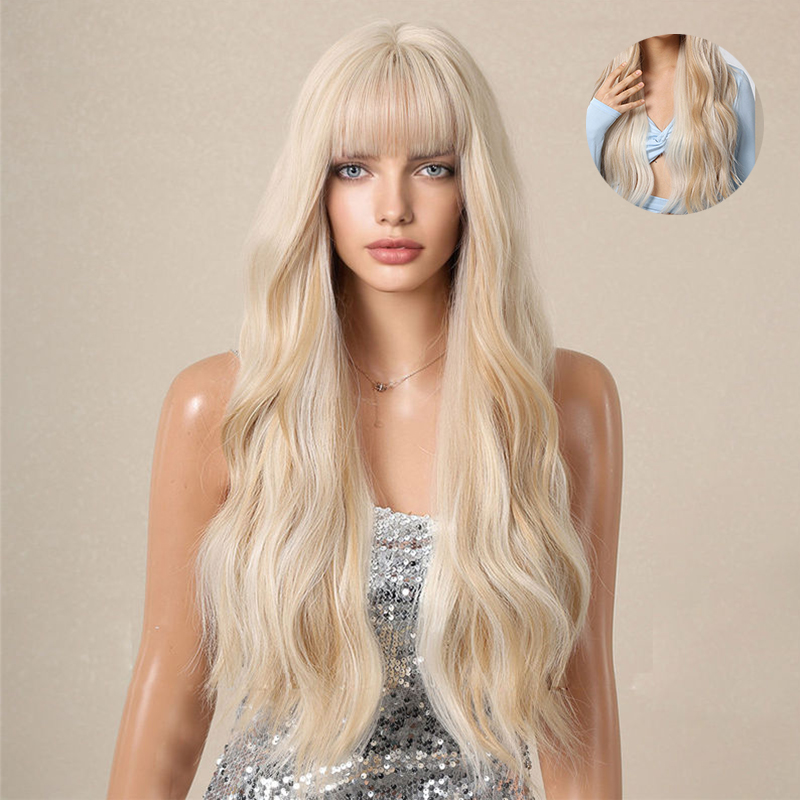 Qi Bangs White Gold Color Barbie Style Big Wave Long Curly Hair Fluffy Wig Full-Head Wig