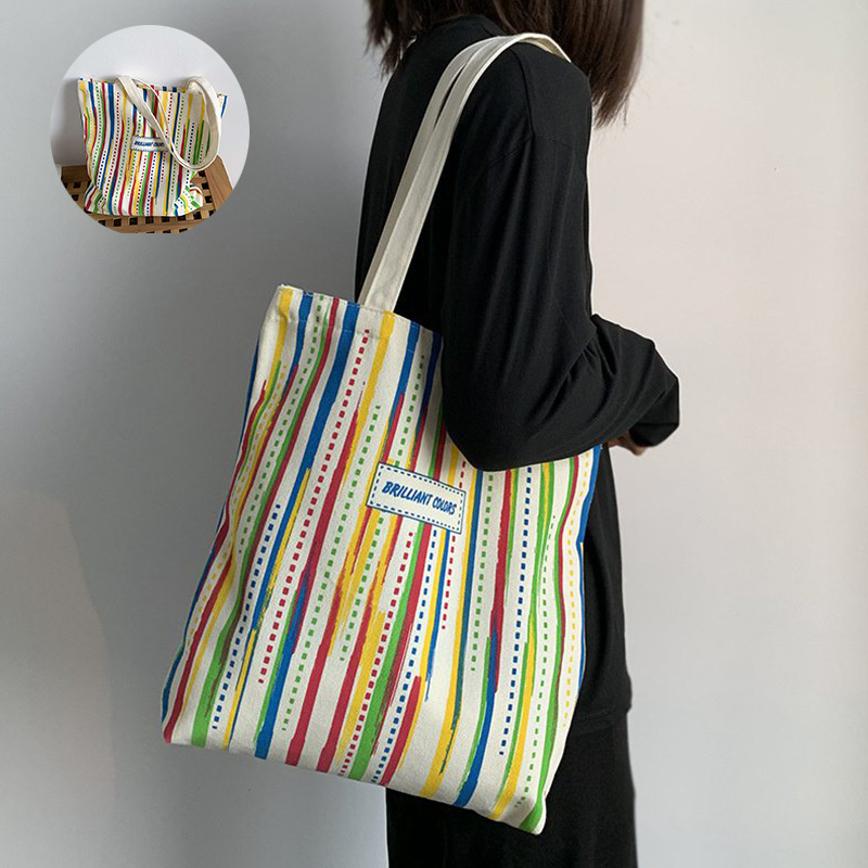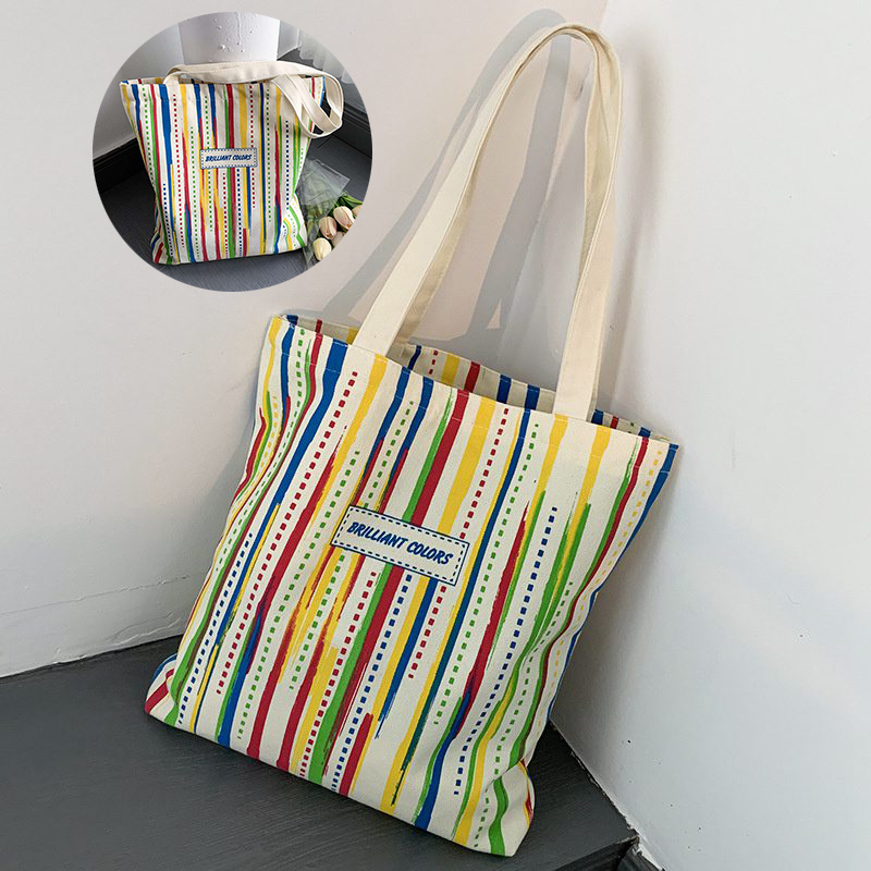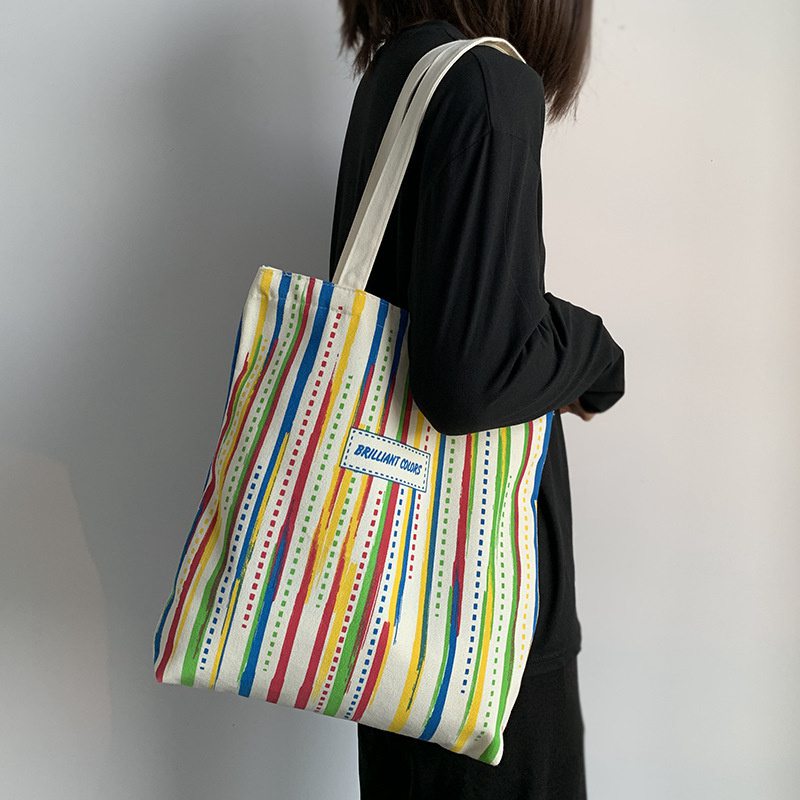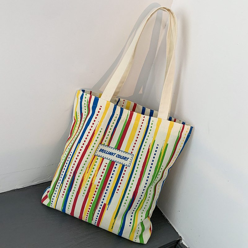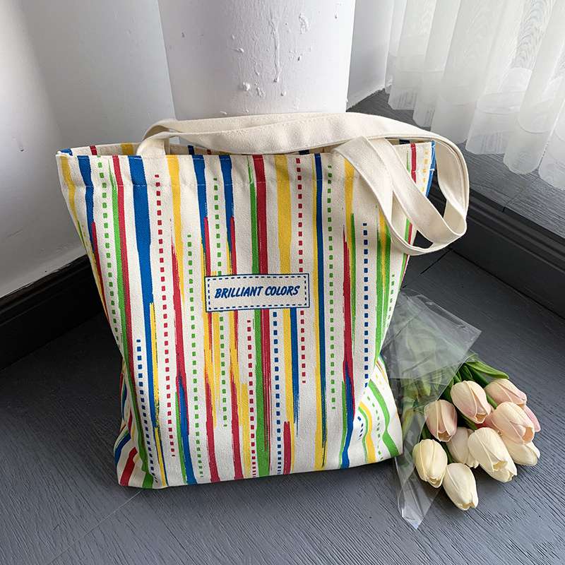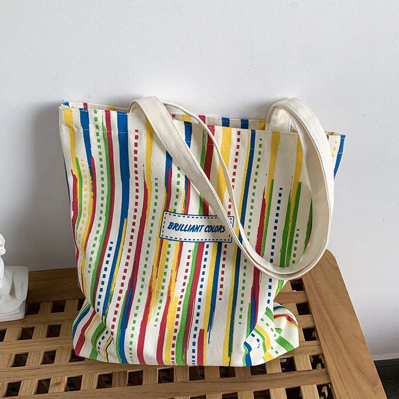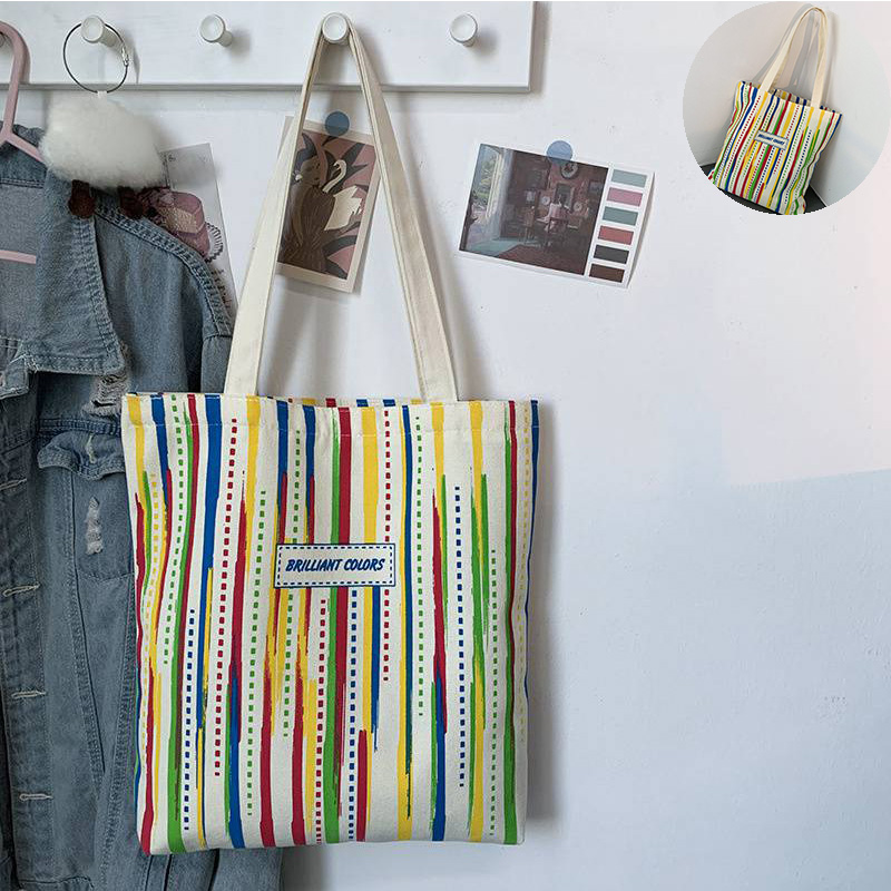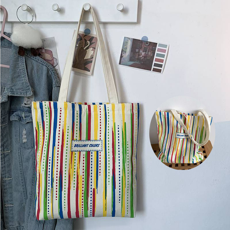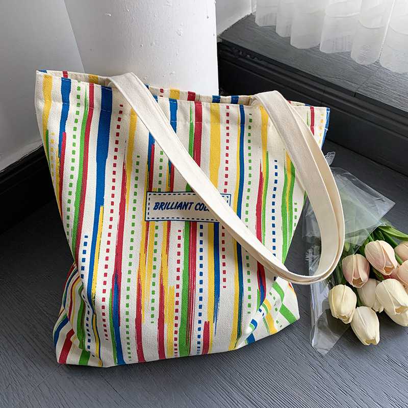 Rainbow Striped Canvas Bag Tote Bag Female One Shoulder Literary Travel Bag Student Class School Bag New Shopping Bag