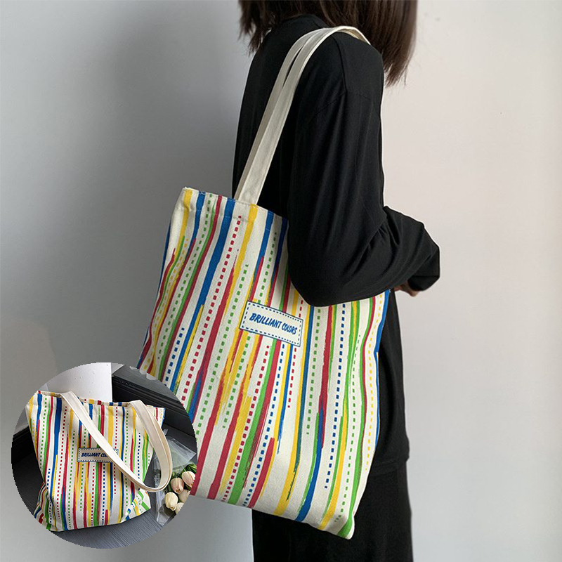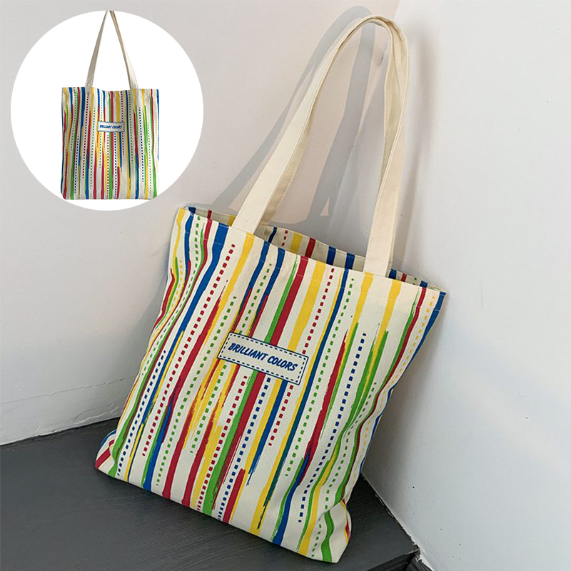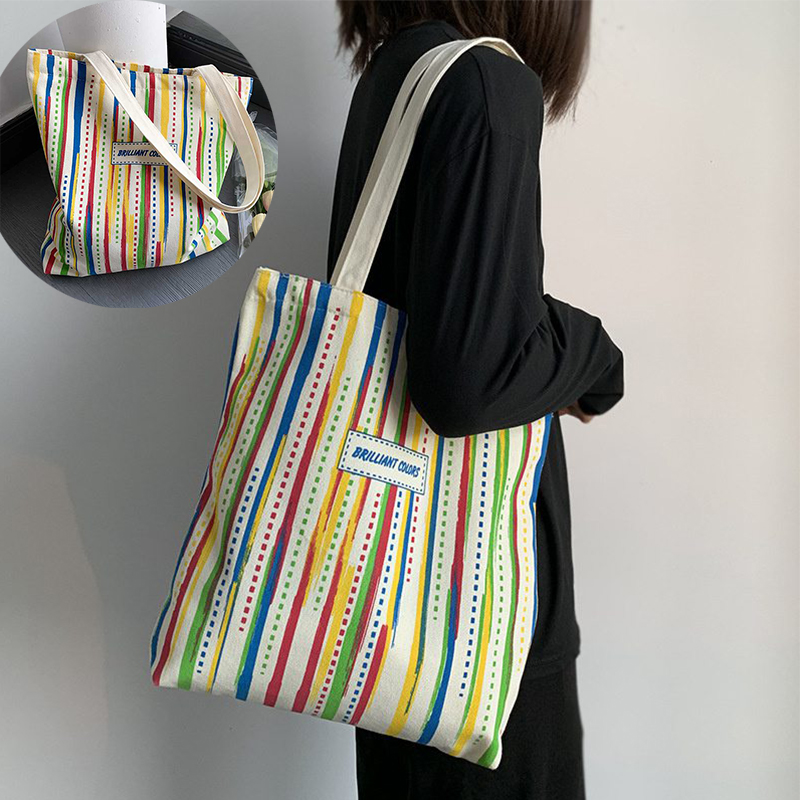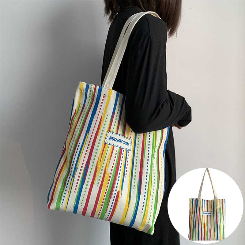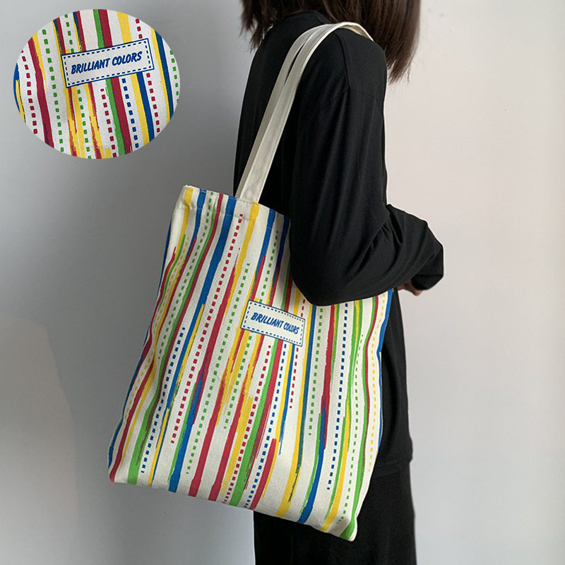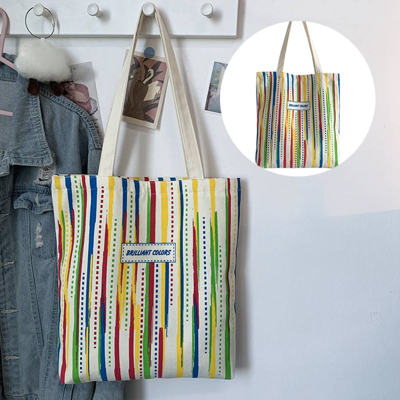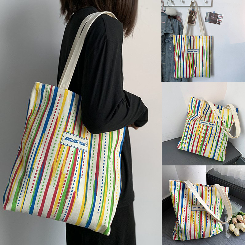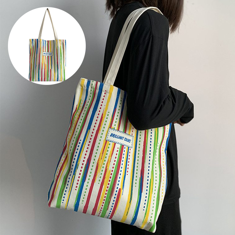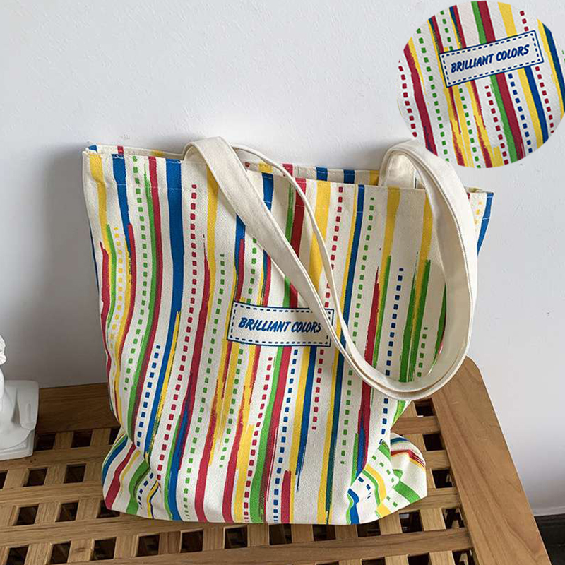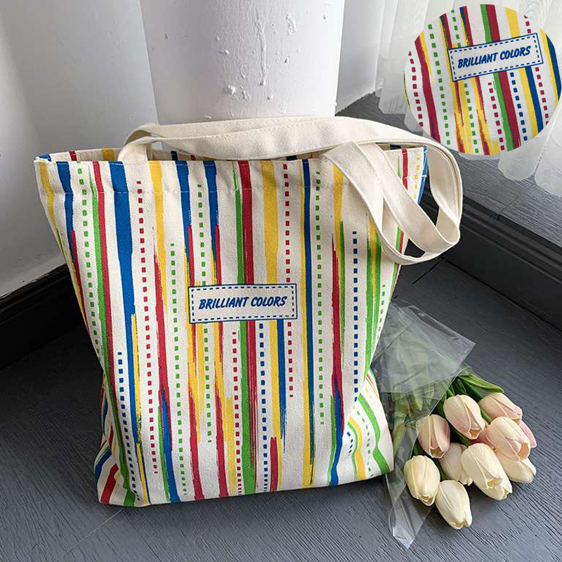 Rainbow Striped Canvas Bag Tote Bag Female One Shoulder Literary Travel Bag Student Class School Bag New Shopping Bag