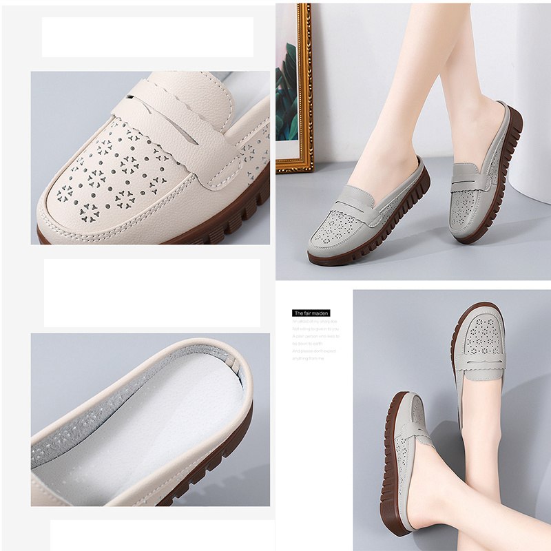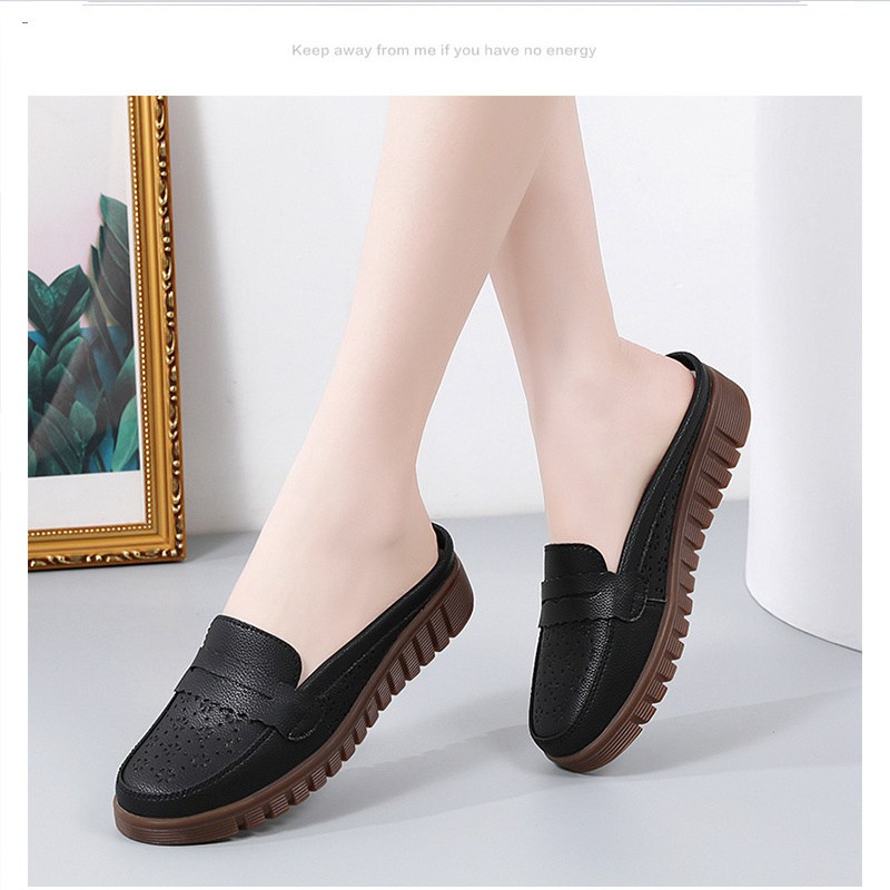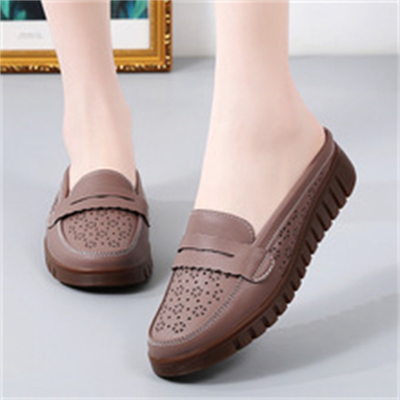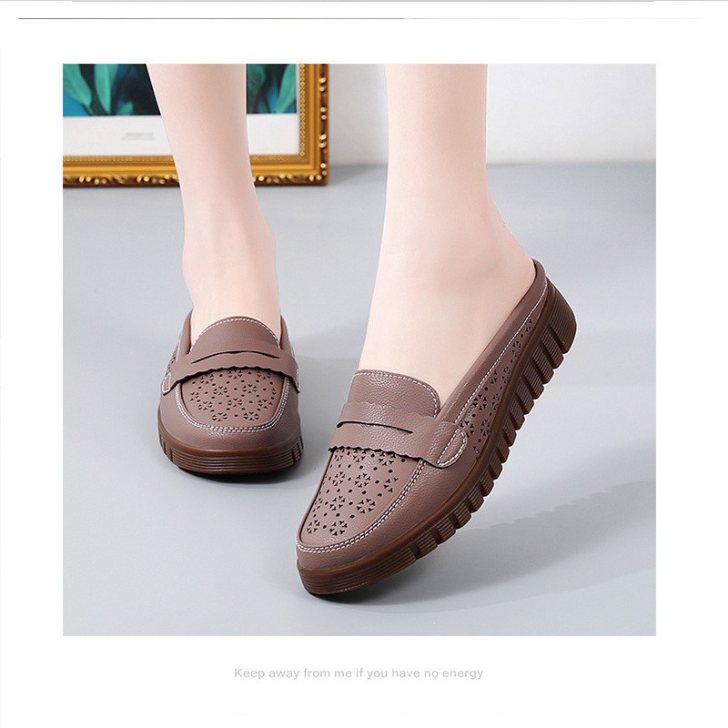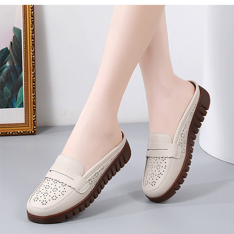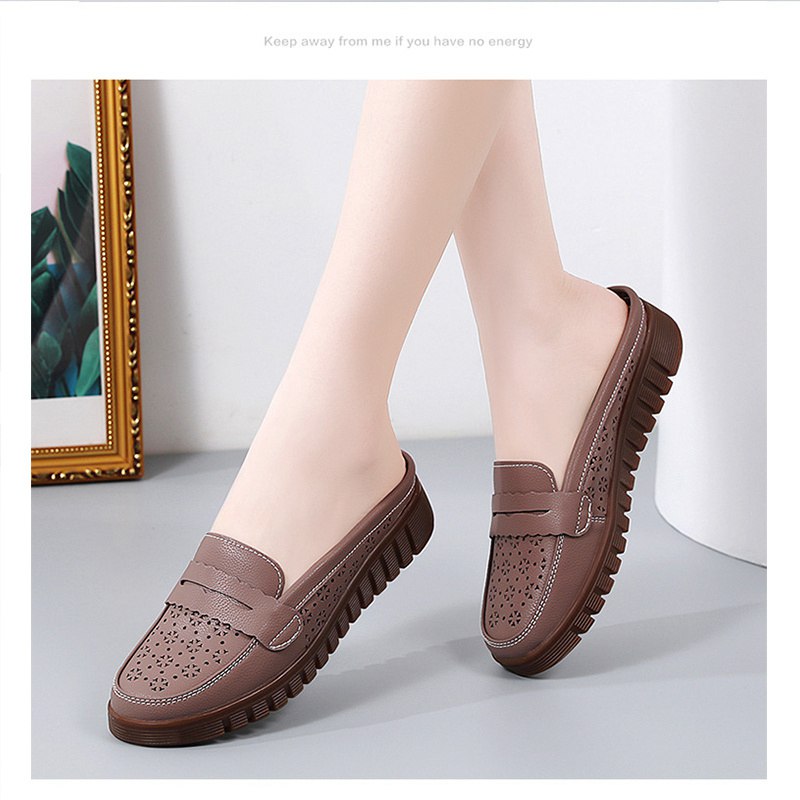 Summer Hollowed Toe Box Slippers Women’s Outer Wear Beef Tendon Flat Middle-Aged and Elderly Retro Mom Shoes Genuine Leather Sandals Large Size