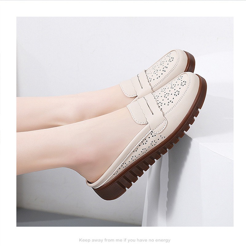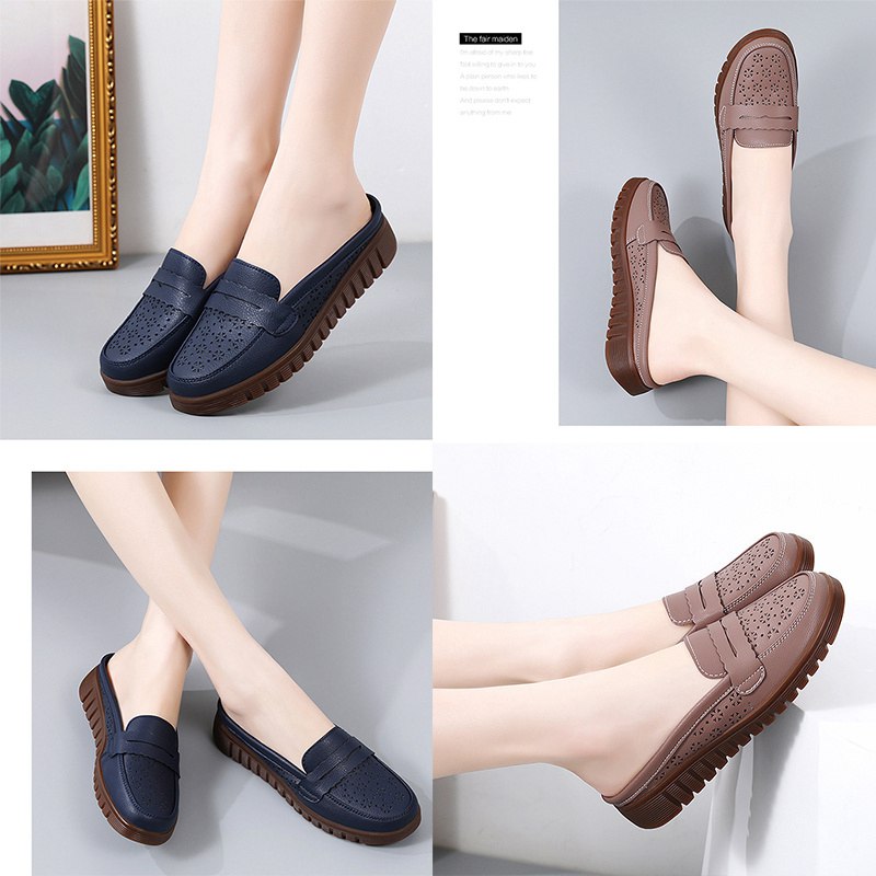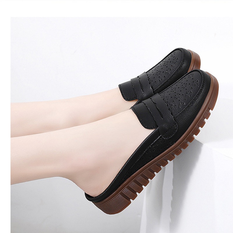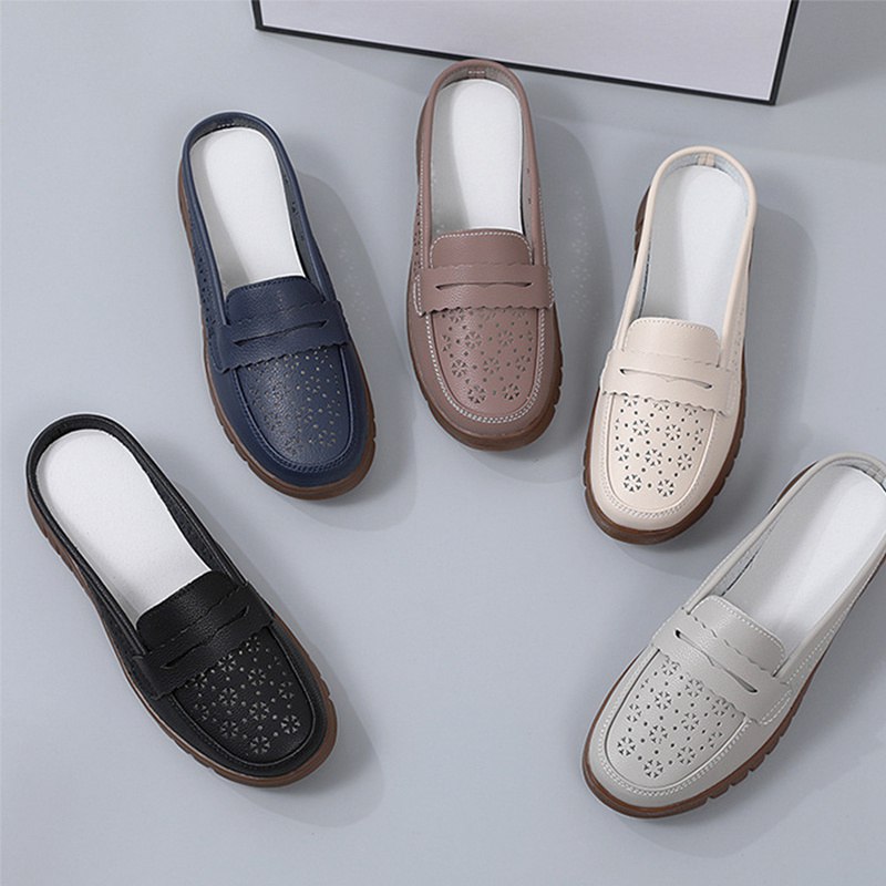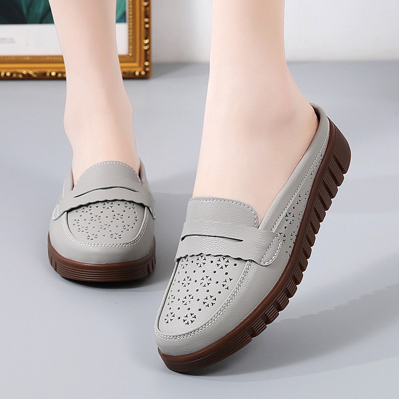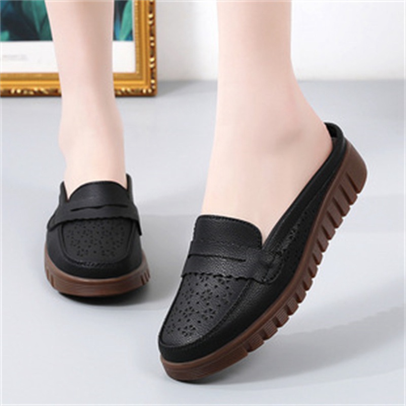 Summer Hollowed Toe Box Slippers Women’s Outer Wear Beef Tendon Flat Middle-Aged and Elderly Retro Mom Shoes Genuine Leather Sandals Large Size
