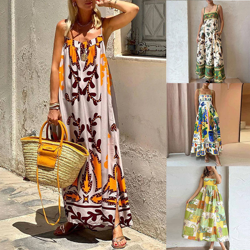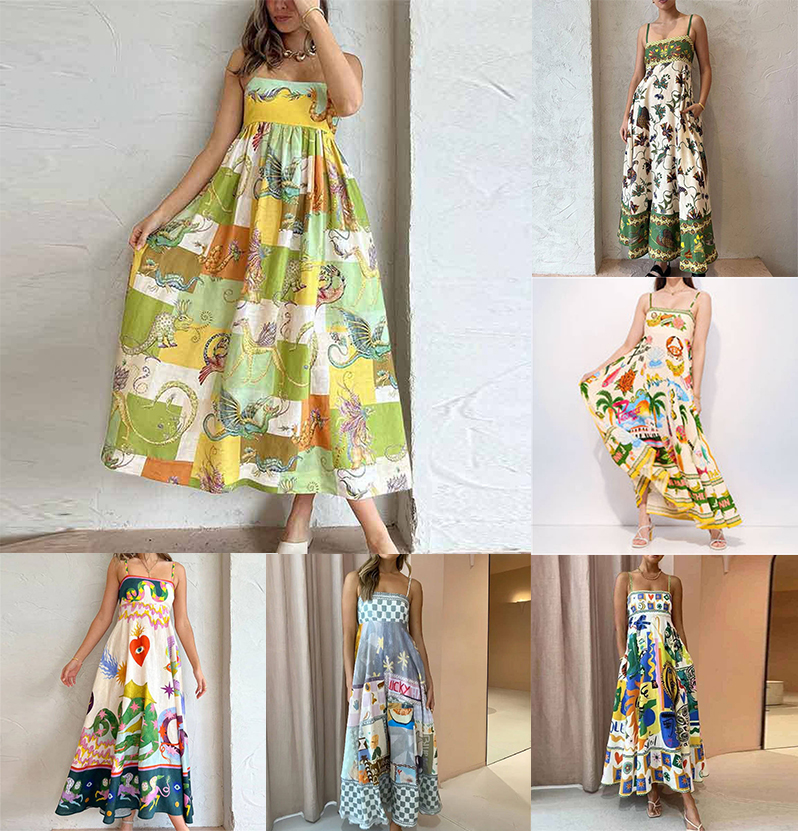 Women’s Clothing Elegant High Waist Print Sling Casual Fashion Dress Sleeveless