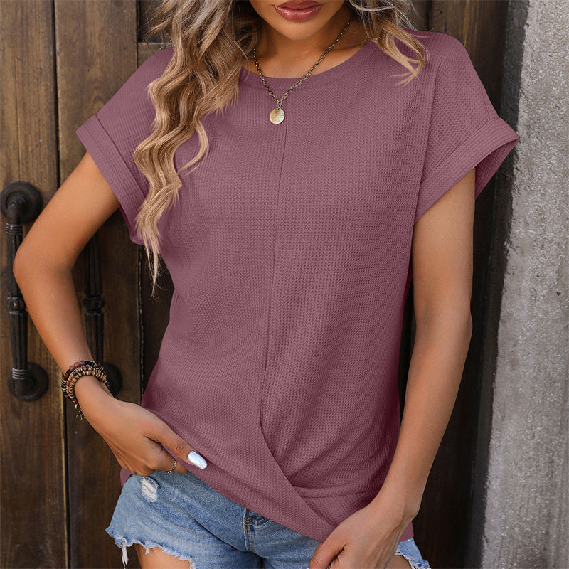 Women’s Clothing Solid Color Waffle Twist Loose Short Sleeve T-Shirt Round Collar Top