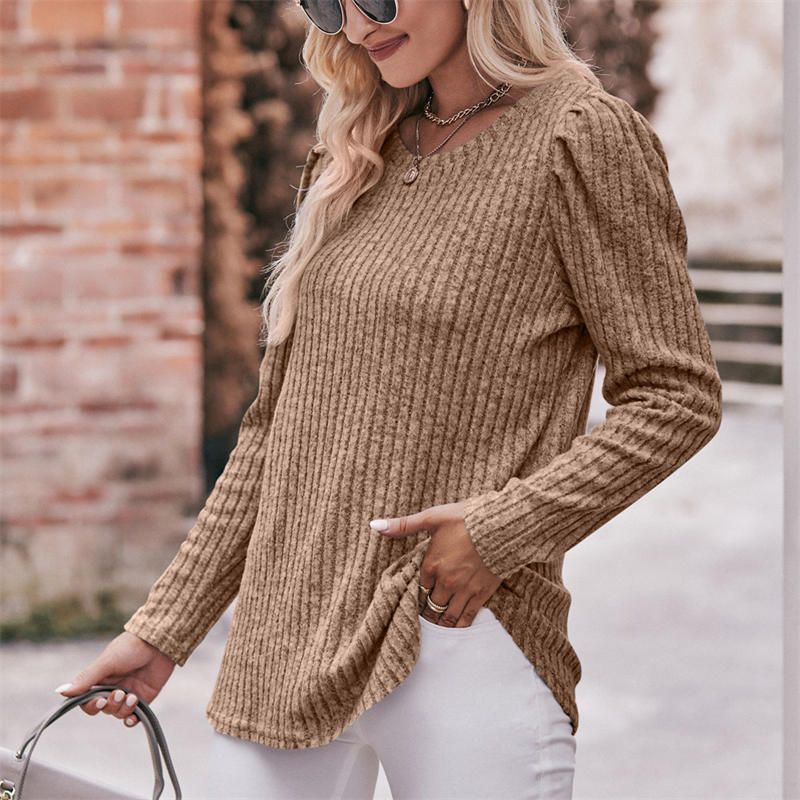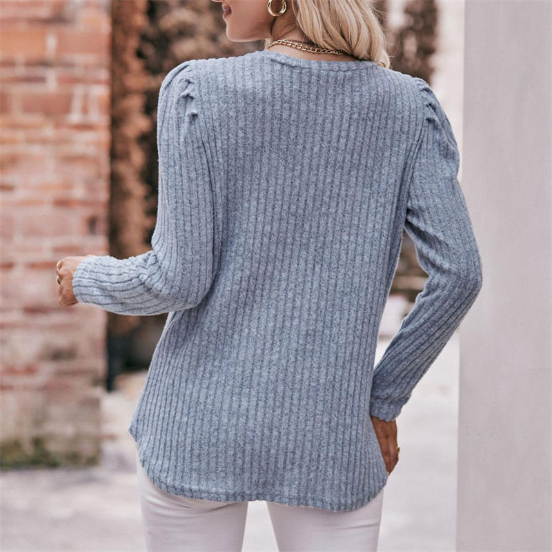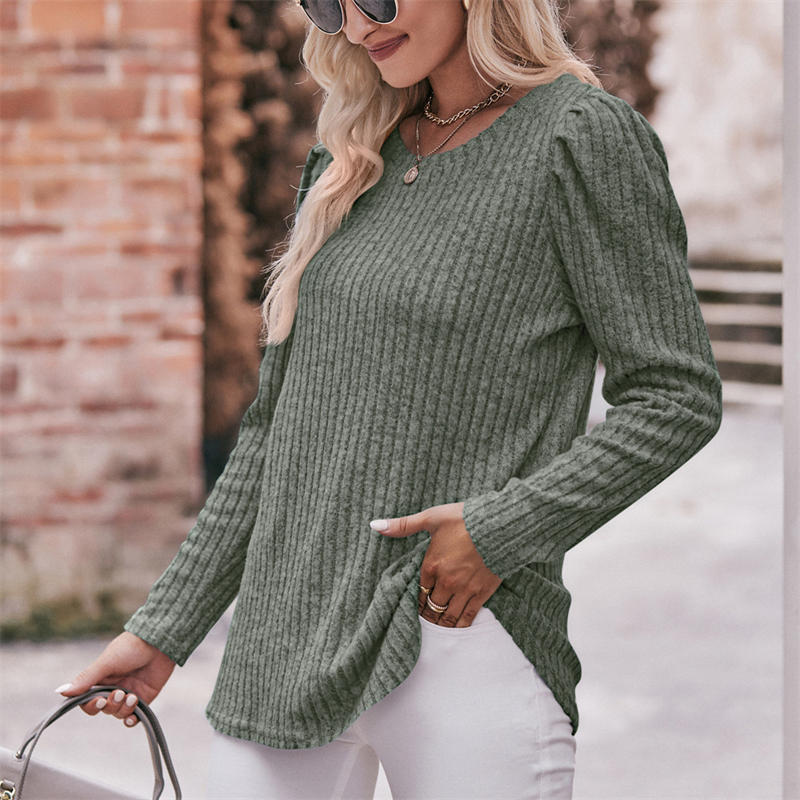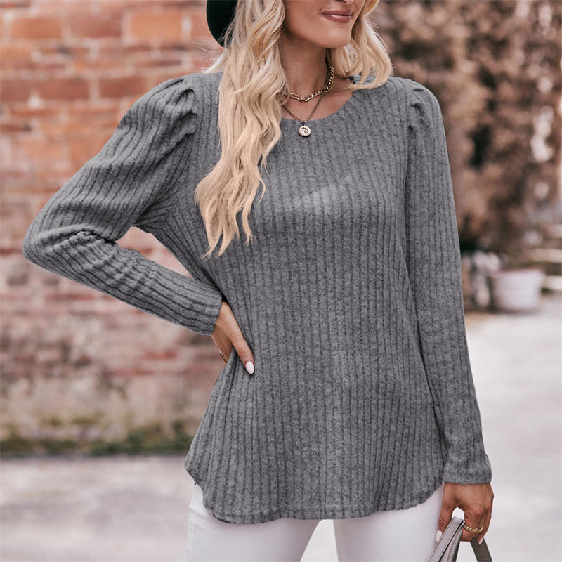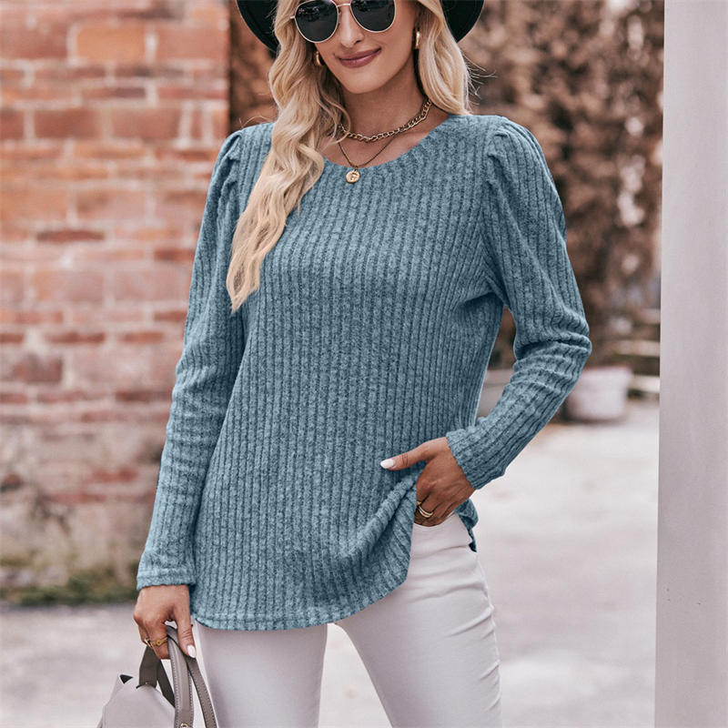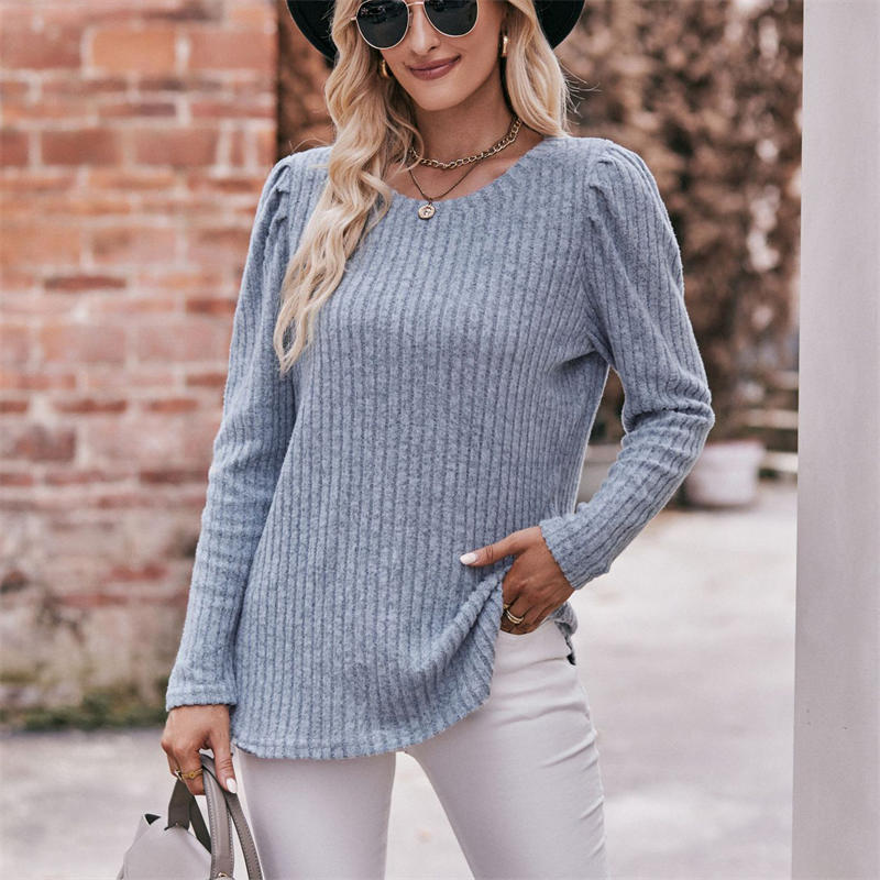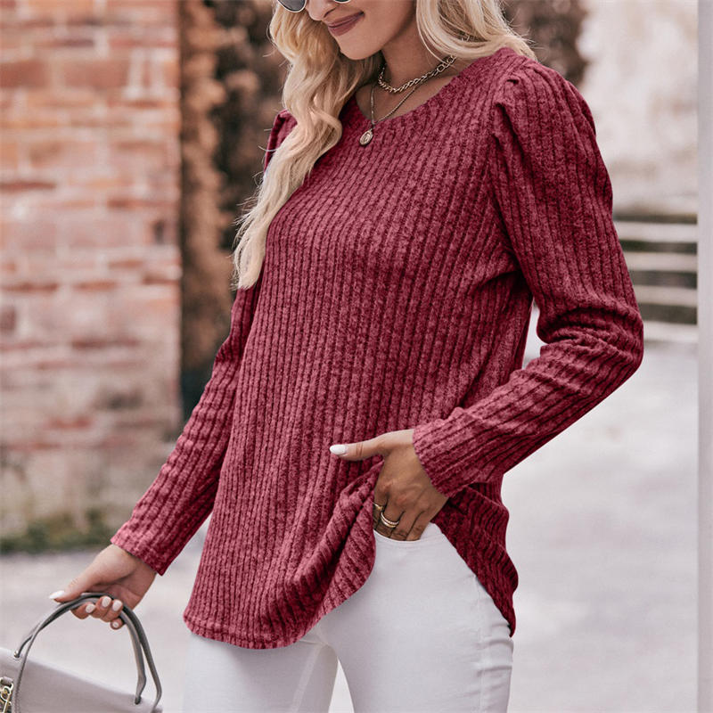 Women’s Round-Neck Puff Sleeve Brushed Sunken Stripe Solid Color Upper Clothes Long Sleeves T-shirt